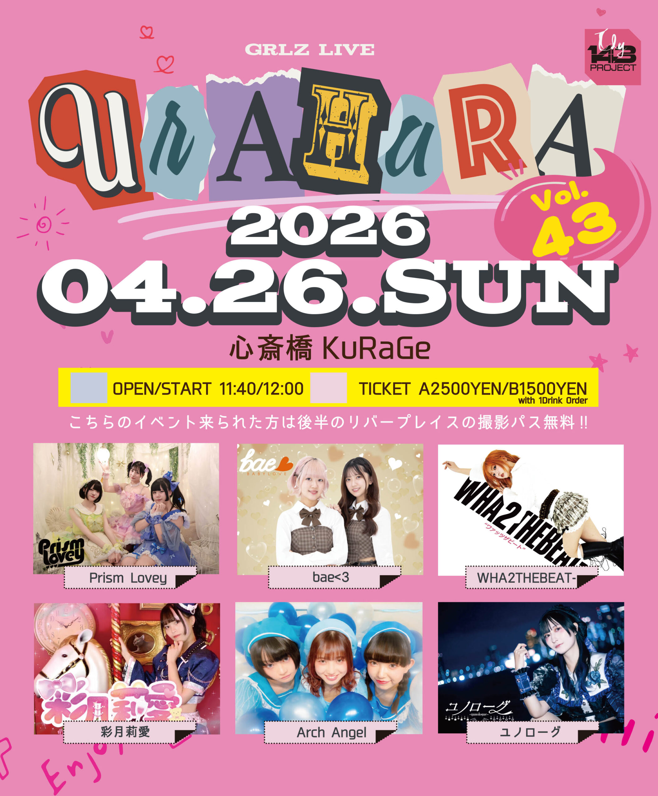 ・Aチケット 2500YEN/別途ドリンク代金&撮影パス付き ・Bチケット 1500YEN/別途ドリンク代金