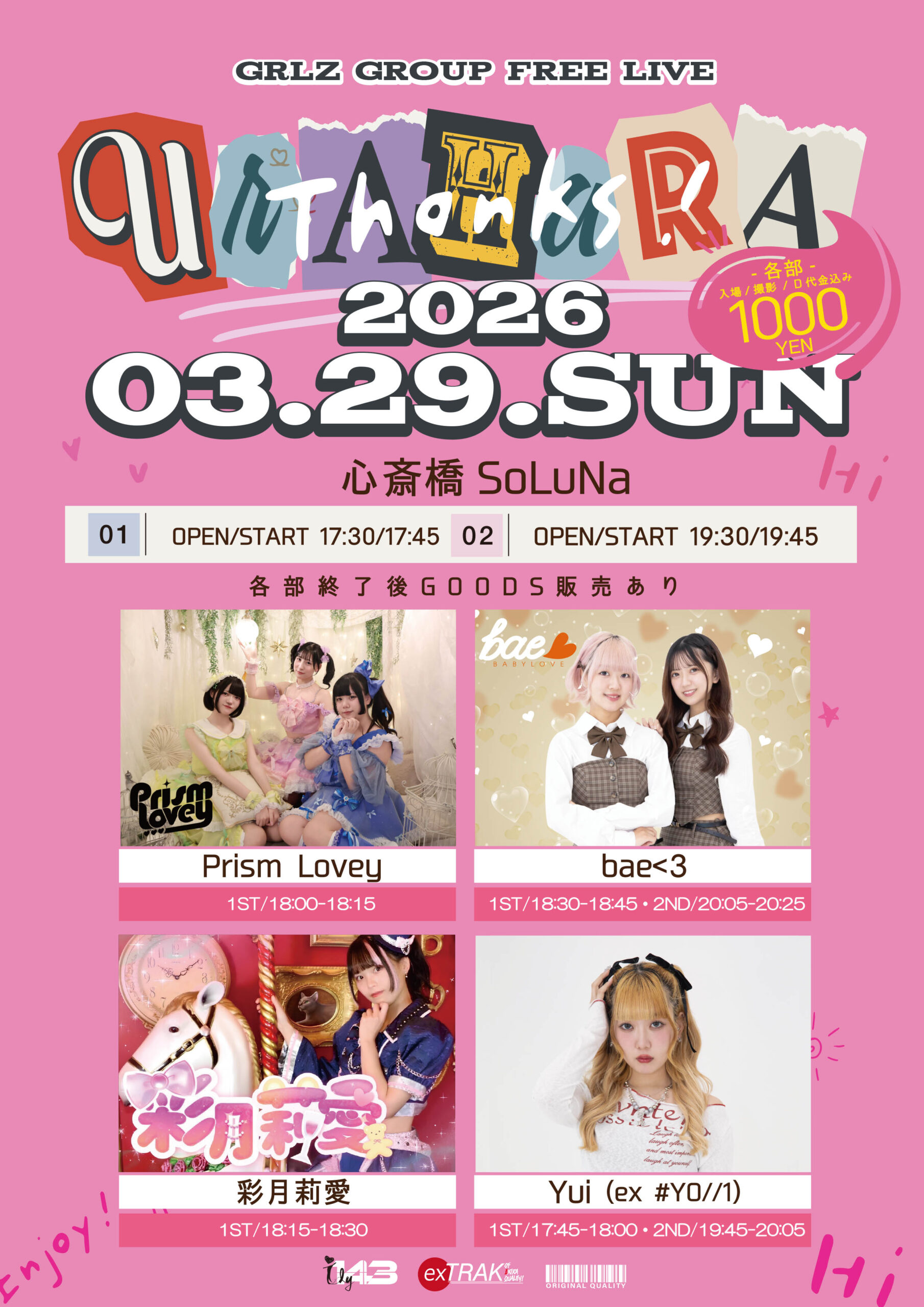 ・1st_OPEN/START 17:30/17:45 ・2nd_OPEN/START 19:30/19:45 ※各ライブ終了後GOODS販売あり